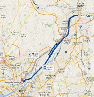 Perjalanan dari stesen ShinOsaka ke stesen Kyoto hanyalah kurang dari 15 minit dengan menaiki Tokaido/Sanyo shinkansen.